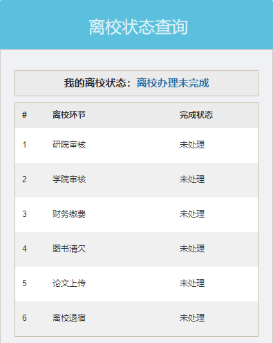 研究生有6個離校項目,分別是研院審核,學院審核,財務繳費,圖書清欠,論文上傳,離校退宿。對應項目完成后,可查看相應辦理情況。