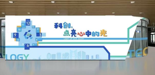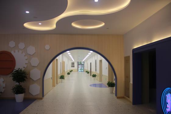 這所將“科創”作為園名的新幼兒園,是我校與臨港新片區管委會、浦東新區教育局戰略合作框架協議之下設立的學校,設計規模為21個班。走進大門,不規則形狀的乳白色吊頂和藍紫色地面營造出無垠宇宙的空闊感,飛碟造型的小蹦床和墻面上的航天員影像,讓科幻感撲面而來。墻上八個大字——“和融共創 樂繪童年”,正是附屬浦東臨港科創幼兒園的辦園理念。