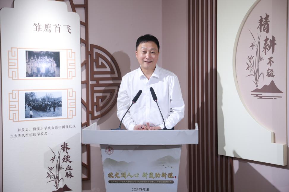 9月1日下午,上海師范大學附屬黃浦梅溪小學“校史潤人心 新質助新程”校史館新展陳揭幕暨人工智能設備捐贈儀式隆重舉行。附屬黃浦梅溪小學創辦人張煥綸先生曾孫女、原華東師范大學黨委書記張濟順,上海師范大學黨委書記林在勇,黃浦區人民政府副區長袁園,上海師范大學教務處處長、基礎教育處處長王健,黃浦區教育局局長郭金華、副局長金羿,以及北大上海校友會創業聯合會、文創與城市更新專業委員會等多方領導、嘉賓蒞臨支持。