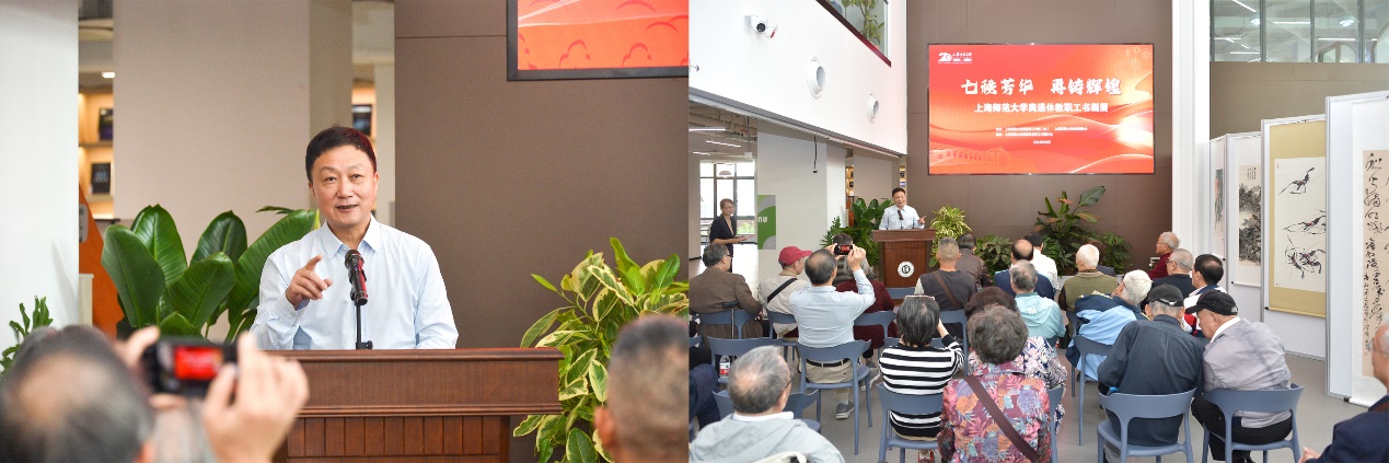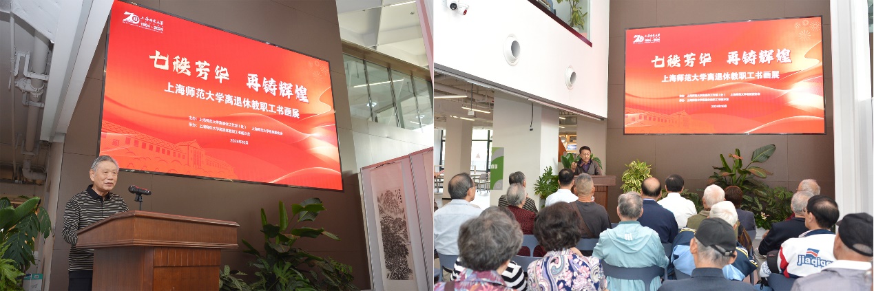 原校黨委書記、書畫沙龍骨干陸建非代表參展老同志發言。他談到,得知校慶70周年之際將要舉辦書畫展,便立即傾心筆墨,創作了書法作品來參展。70年校慶是用校史思政育人的好機會,希望和其他老同志們一起利用自己的興趣愛好,既表達對黨、對學校的真摯感情,又不斷地延續自己生命的厚度和寬度。