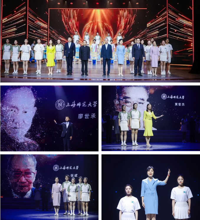 原創情景朗誦《師大的大師》致敬首任院長廖世承、著名唐詩和楚辭研究大家馬茂元、現代漢語語法學家張斌、物理學教育專家束世杰、法國文學專家與翻譯家鄭克魯等名師大家。上海市教衛工作黨委系統“優秀共產黨員·師德標兵”、人文學院查清華教授,上海市首屆教學名師、生命科學學院李利珍教授,全國、上海青教賽獲獎教師傅毅、潘牧天、楊伊、林方婷、方頠瑋和影視傳媒學院學生以真摯的情感娓娓講述,表達對師大大先生們的崇高敬意和傳承師道的堅定決心。