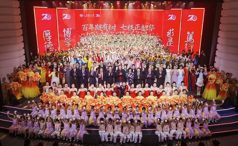 10月15日晚,“百年期有樹 七秩正韶華”上海師范大學建校70周年辦學成果展演在徐匯校區霞棐劇院傾情上演。來自華南師范大學、南京師范大學、福建師范大學等全國30余所師范院校、海內外高校領導,全體校領導,處級干部,學校歷年作出重要貢獻的教師代表,離退休老同志代表,本研學生和附屬學校師生代表,海內外校友代表以及網絡直播平臺26萬名師生、校友,共同慶祝上海師范大學七秩華誕。