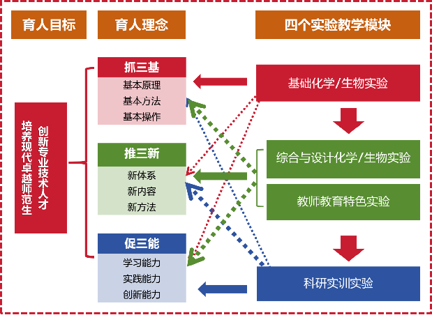 生物化學(xué)實(shí)驗(yàn)教學(xué)示范中心(培育級):以培養(yǎng)化學(xué)、生物學(xué)科現(xiàn)代卓越師范生和創(chuàng)新拔尖專業(yè)技術(shù)人才為目標(biāo)。中心秉持“抓三基(基本原理、基本方法、基本操作)、推三新(新體系、新內(nèi)容、新方法)、促三能(學(xué)習(xí)能力、實(shí)踐能力、創(chuàng)新能力)”育人理念,精心打造“基礎(chǔ)實(shí)驗(yàn)、綜合與設(shè)計(jì)實(shí)驗(yàn)、教師教育特色實(shí)驗(yàn)、科研實(shí)訓(xùn)實(shí)驗(yàn)”4個(gè)實(shí)驗(yàn)教學(xué)平臺(tái),建立分層次實(shí)驗(yàn)教學(xué)新體系,實(shí)現(xiàn)“所有學(xué)生普遍成才,優(yōu)秀學(xué)生脫穎而出”的培養(yǎng)新模式。