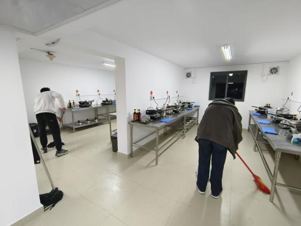 此次勞動教育實踐基地的特色項目是勞動教育烹飪課程,本次課程持續兩周,每位學生共計進行10小時的烹飪體驗,通過教授烹飪技能,幫助學生體驗勞動樂趣,培養動手能力和團隊合作精神。在烹飪課程中,學校食堂師傅耐心講授烹飪技巧,帶領學生深度體驗從食材準備到烹飪完成的全過程。烹飪結束后,學生主動清洗鍋碗瓢盆、打掃臺面、掃地拖地。