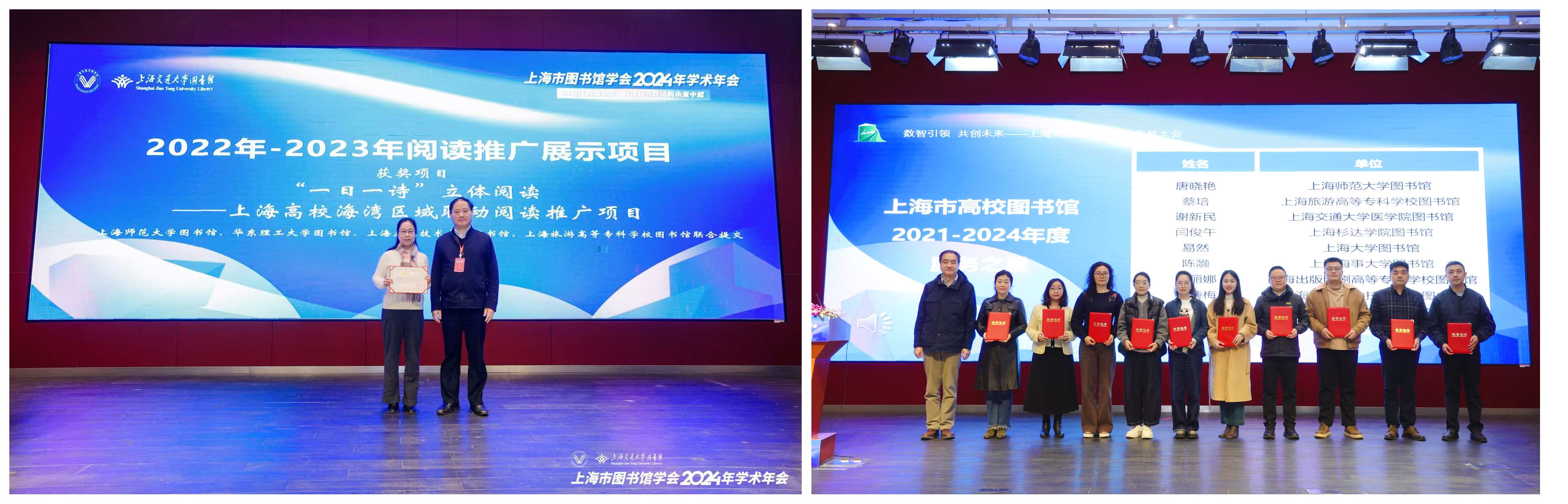 本次會議還進行了中國圖書館學會“展示項目”及上海高校圖工委先進評選頒獎。由校圖書館牽頭申報的“‘一日一詩’立體閱讀----上海高校海灣區域聯動閱讀推廣項目”進入中國圖書館學會組織評選的“2022年-2023年閱讀推廣展示項目”名單。在上海市高校圖工委組織的“上海市高校圖書館2021-2024年度先進評選”中,我校圖書館特藏保護與研究中心獲評“先進集體”、唐曉艷獲評“服務之星”、段曉林獲評“優秀館長”。