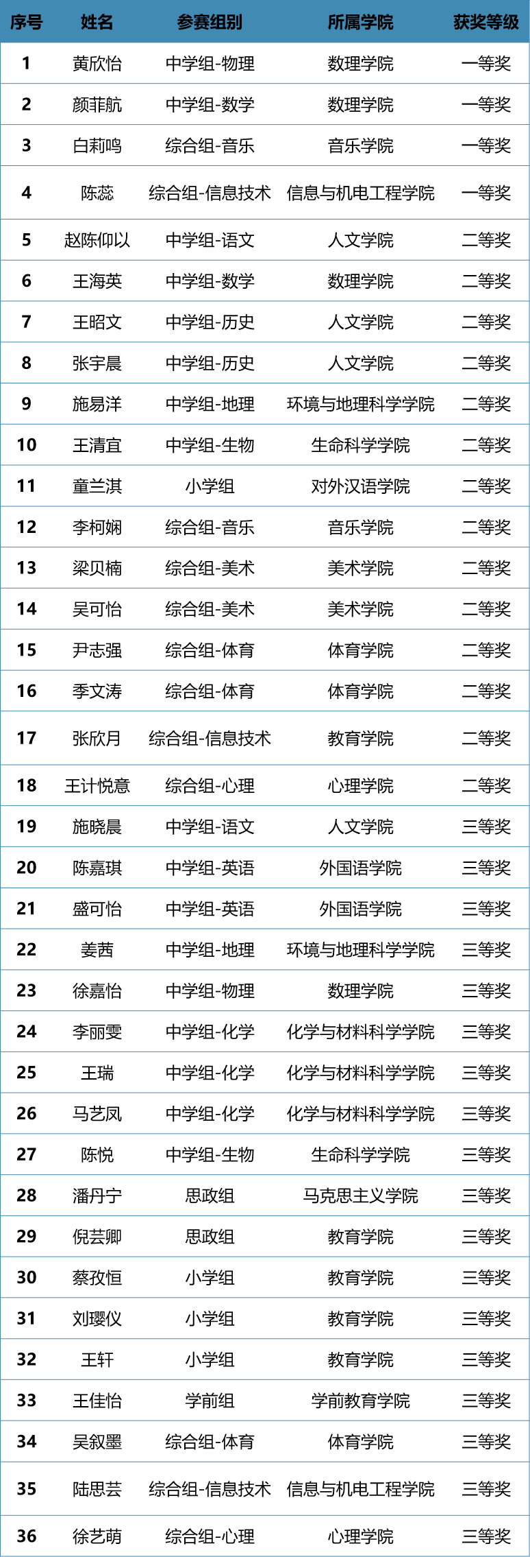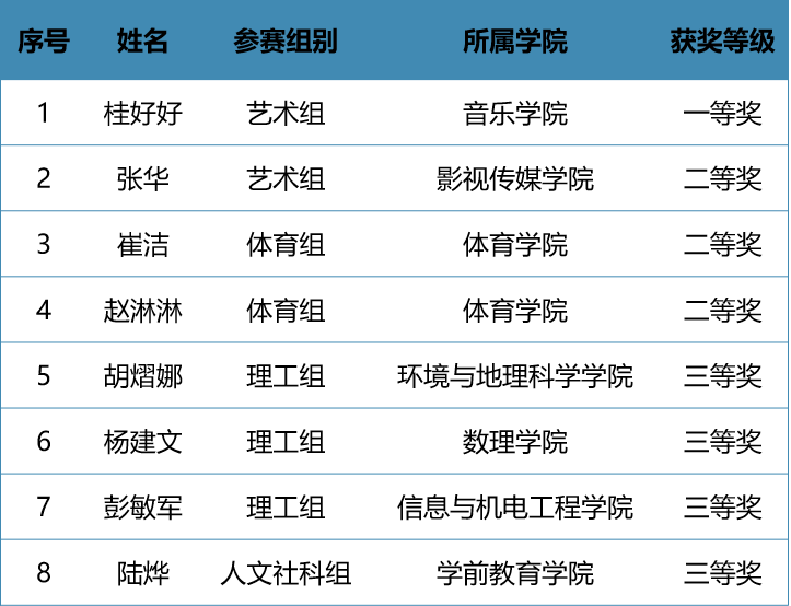 由上海市教育委員會、浙江省教育廳、江蘇省教育廳、安徽省教育廳聯合主辦,長三角教師教育聯盟協辦,安徽師范大學承辦的第六屆長三角師范院校教師智慧教學大賽和師范生教學基本功大賽在安徽師范大學舉行。來自長三角地區52所高校的70名教師選手、292名學生選手入圍決賽,我校師生在本次比賽中斬獲佳績。其中,音樂學院桂好好老師榮獲一等獎,影視傳媒學院張華老師等3位老師榮獲二等獎,環境與地理科學學院胡熠娜老師等4位老師榮獲三等獎;數理學院黃欣怡等4名同學榮獲一等獎,人文學院趙陳仰以等14名同學榮獲二等獎,外國語學院陳嘉琪等18名同學榮獲三等獎。