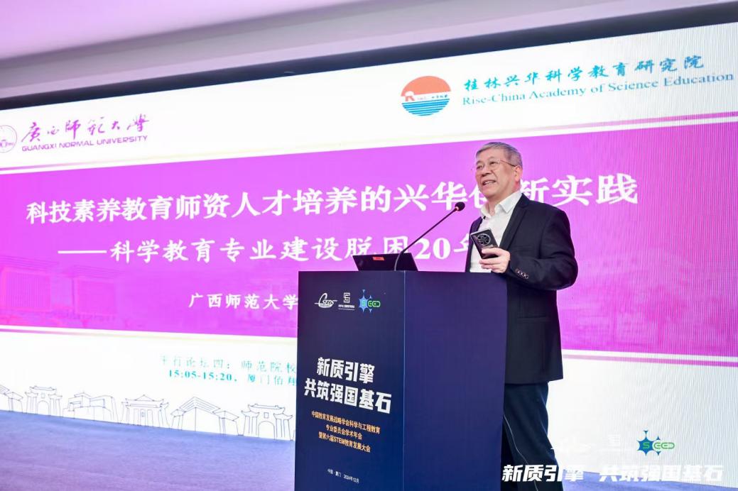 廣西師范大學(xué)教授、博導(dǎo)羅星凱教授在發(fā)言中介紹了科技素養(yǎng)教育師資人才培養(yǎng)的興華創(chuàng)新實踐。科技素養(yǎng)教育不僅僅是知識的傳授,更是對教師創(chuàng)新能力和實踐能力的全面培養(yǎng)。課程應(yīng)從拼盤走向融合,以解決當(dāng)前面臨的挑戰(zhàn)。羅星凱以在香港教育學(xué)院參加研討會為例,闡述綜合課程發(fā)展趨勢是內(nèi)容與學(xué)生學(xué)習(xí)、認(rèn)知及教師教學(xué)的融合。他指出,教育改革不僅要關(guān)注學(xué)生的科技素養(yǎng)提升,更要注重教師自身素養(yǎng)的提升,只有教師具備更高的科技素養(yǎng),才能更好地培養(yǎng)學(xué)生的創(chuàng)新精神。