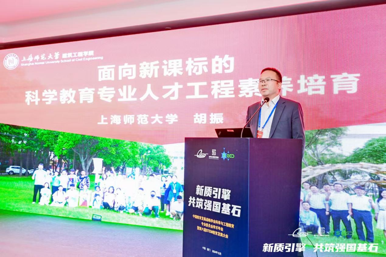我校建筑工程學(xué)院院長胡振教授分享了面向新課標(biāo)的科學(xué)教育專業(yè)人才工程素養(yǎng)培育。胡振從科學(xué)教育專業(yè)人才培養(yǎng)及實踐出發(fā),介紹了探索工程導(dǎo)向的人才培養(yǎng)方案的經(jīng)驗。面對現(xiàn)有的科學(xué)教育專業(yè)培養(yǎng)存在學(xué)科基礎(chǔ)不平衡、工程素養(yǎng)不足等問題,胡振提出應(yīng)培養(yǎng)兼具教學(xué)與科普能力的人才,堅持學(xué)科基礎(chǔ)與工程技術(shù)融合,具備三維思維,通過強(qiáng)交叉、全實踐、大整合的方式設(shè)計課程。