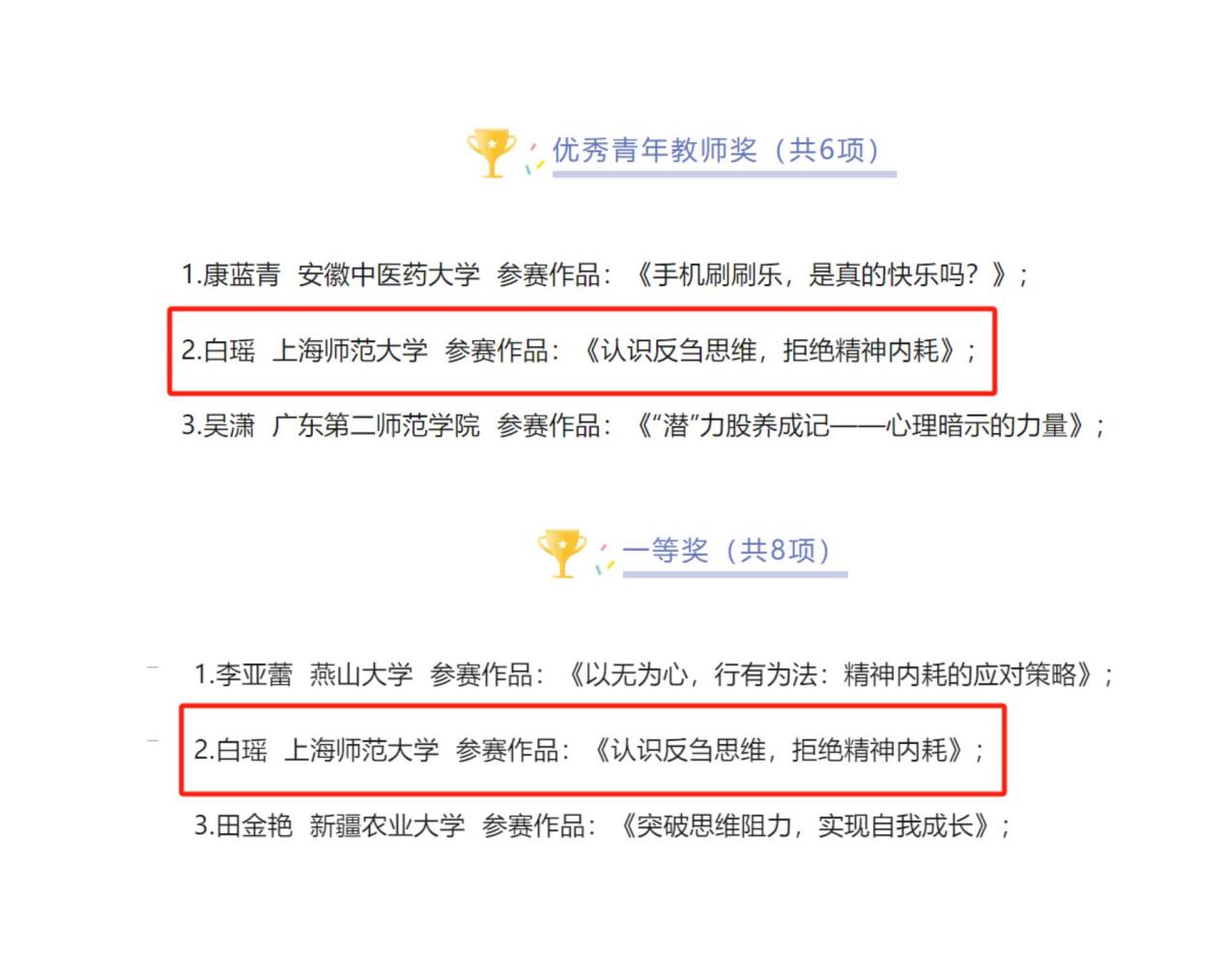 為貫徹落實教育部等17部門《全面加強和改進新時代學生心理健康工作專項行動計劃 (2023—2025年 ) 》文件精神,充分發揮課堂教學在大學生心理健康教育工作中的主渠道作用,由北京心舍聯合國內諸多高校舉辦的“第五屆全國高校心理健康課微視頻比賽”近日落下帷幕。本次比賽共有來自26個省份、108所高校的157份參賽作品,經過教師評委和大學生評委的綜合評審,我校馬克思主義學院心理輔導員白瑤脫穎而出,憑借作品《認識反芻思維,拒絕精神內耗》成功斬獲大賽“一等獎”和“優秀青年教師獎”兩項殊榮。