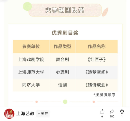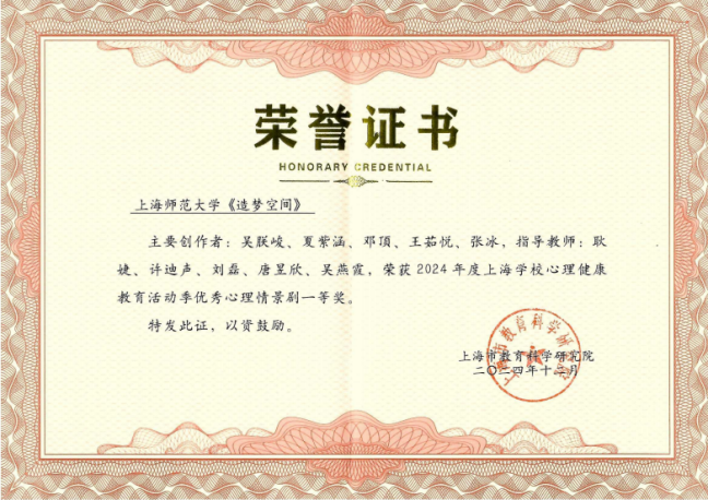 近日,由上海市教育委員會指導,上海市藝術教育委員會、上海學生戲劇聯盟主辦,復旦大學、上海話劇藝術中心承辦,上海市戲劇家協會協辦的第三屆上海校園戲劇節展演圓滿結束,我校心理咨詢與發展中心指導、教育學院和影視傳媒學院共同創排的心理情景劇作品《造夢空間》獲得優秀劇目獎。同時此劇還獲得2024年度上海學校心理健康教育活動季優秀心理情景劇一等獎的佳績,我校在活動季中表現突出,獲“2024年度上海學校心理健康教育活動季優秀組織獎”,這也是我校第十次蟬聯優秀組織獎。