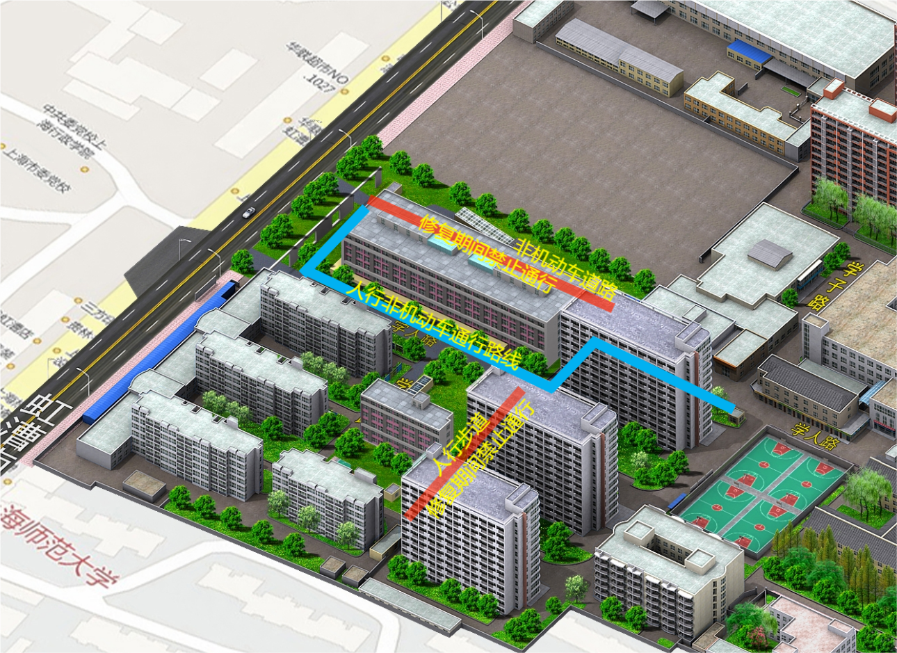 2. 區域:徐匯校區學生公寓西十五東側人行步道、學生公寓西十六北側非機動車道(見下圖紅色路段)。