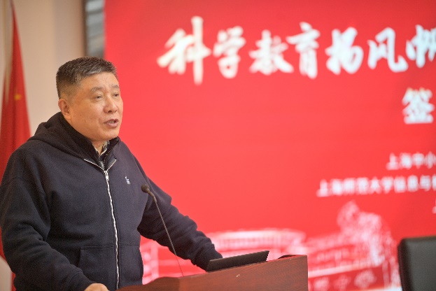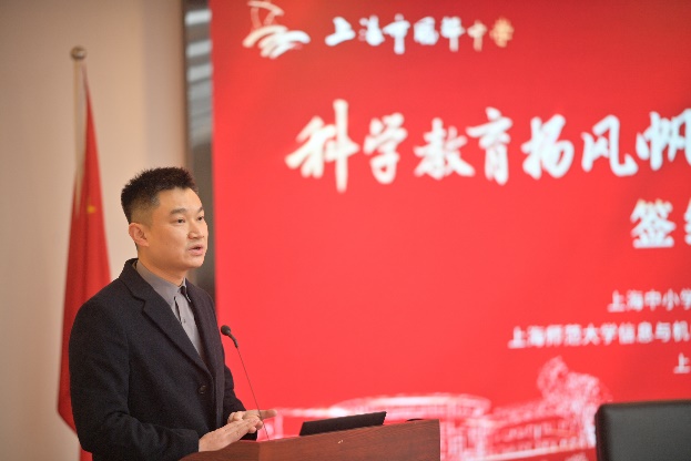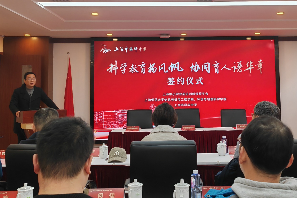 為加速聯動培育體系建設,推進學校教育交叉創新研究成果落地,實現大中小學教育資源開放共享,2024年12月26日上午,我校信息與機電工程學院、環境與地理科學學院和上海中小學雙前沿創新課程平臺、上海市風華中學共同簽訂教育合作協議,暨合作基地揭牌儀式在上海市風華中學舉行。我校科技處處長李輝、上海市教師教育學院(上海市教育委員會教學研究室)部長喬麗華、上海市中小學前沿科學前沿技術創新課程平臺負責人秦浩正、信息與機電工程學院黨委書記陳曉虹、環境與地理科學學院副院長陳浮、上海市風華中學校長朱瑜以及各相關單位教師代表出席。