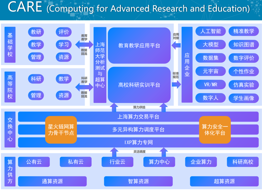 在AI for Education驅(qū)動(dòng)教育教學(xué)高質(zhì)量發(fā)展、AI for Science引領(lǐng)科研范式深層次變革的歷史機(jī)遇下,AI技術(shù)與教育、科研的深度融合成為可能。然而,面對(duì)當(dāng)前教育、科研領(lǐng)域算力應(yīng)用場(chǎng)景雜、算力需求品種多、算力推廣門檻高等特點(diǎn),亟需一個(gè)算力平臺(tái)來(lái)對(duì)底層算力資源進(jìn)行統(tǒng)一匯聚、按需調(diào)配、動(dòng)態(tài)調(diào)度,以支撐上層各類教育、科研行業(yè)的模型和應(yīng)用穩(wěn)定運(yùn)行。那么該如何去構(gòu)建這樣一個(gè)面向教育垂直行業(yè)的算力平臺(tái)呢?上海師范大學(xué)率先探索出一條新路徑。