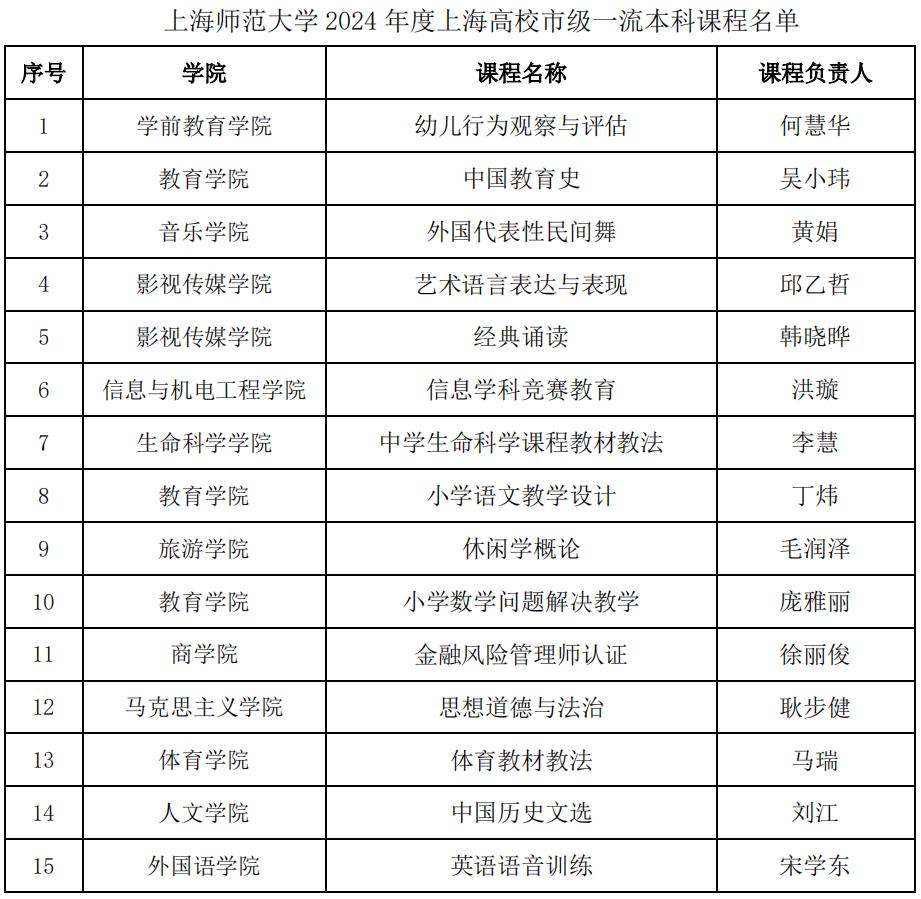 近日,上海市教委發布了《上海市教育委員會關于公布2024年度上海高校市級一流本科課程認定結果的通知》(滬教委高〔2025〕5號),認定346門課程為2024年度上海高校市級一流本科課程。我校15門課程獲批2024年度上海高校市級一流本科課程,認定課程門數位居市屬高校第二,截至目前,學校累計獲批89門上海高校市級一流本科課程。