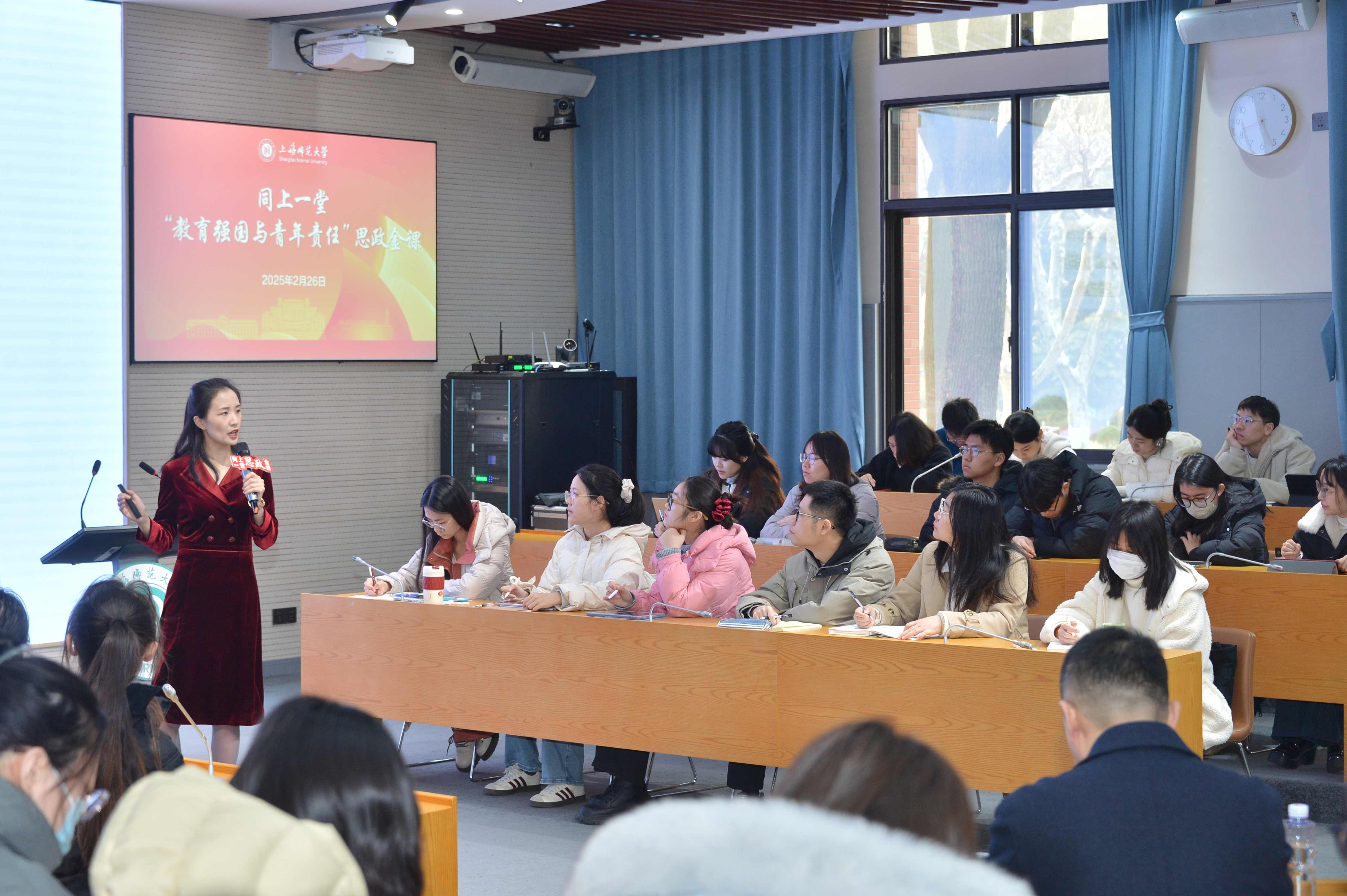 為深入貫徹落實習近平總書記關于教育的重要論述,深入貫徹落實全國教育大會精神和上海教育大會精神,2月26日學校在徐匯校區第六教學樓108室舉行“同上一堂‘教育強國與青年責任’思政金課”。校黨委書記林在勇,全國青教賽一等獎獲獎者、教育學院楊伊副教授,馬克思主義學院副院長周治華共同講授《習近平總書記關于教育的重要論述研究》個論課程,幫助青年學生領會新思想,激發新使命。人文學院學科教學(語文、歷史方向)碩士研究生、心理學院心理健康教育碩士研究生等百余名學生參加。