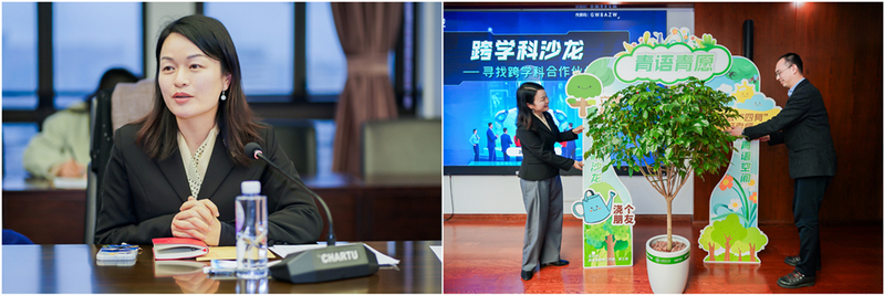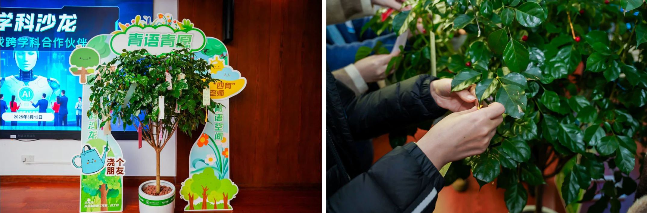 首期沙龍開展的當日正是植樹節(jié),楊海燕代表學校為青年教師們送上了一份特殊的植樹節(jié)禮物:“一棵樹”和“一粒種”。她將小樹命名為“青語青愿樹”,并寓意印有“跨學科沙龍”LOGO的綠植卡為“種子卡”,鼓勵青年教師在人工智能時代,保持耐心和期待,慢慢種植、澆灌和培育,讓這顆職業(yè)生涯發(fā)展的種子茁壯生長。
