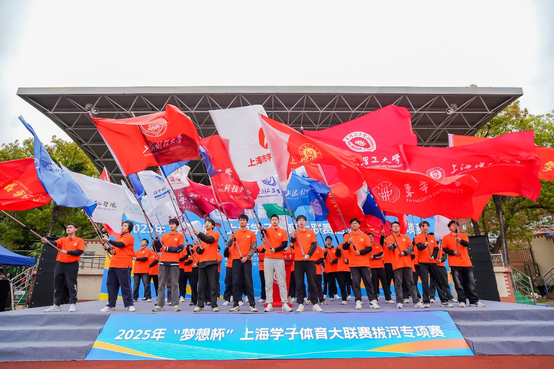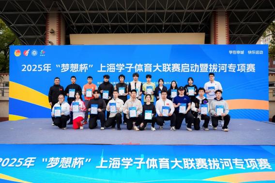 共青團(tuán)上海市委員會副書記王江出席開幕式,并宣布2025年“夢想杯”上海學(xué)子體育大聯(lián)賽啟動,拔河專項賽開幕。