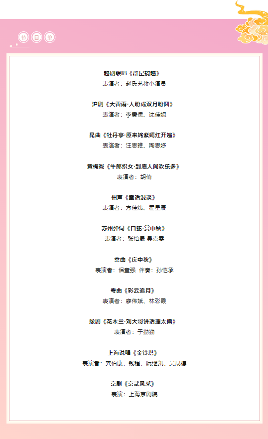 此次《九州百戲》在中秋節前夕舉辦,演出以“月圓人團圓”為主題,安排了滬劇《大雷雨·人盼成雙月盼圓》、黃梅戲《牛郎織女·到底人間歡樂多》、蘇州彈詞《白蛇·賞中秋》、岔曲《慶中秋》和粵曲《彩云追月》等“應節”的節目。除此以外,為展現各地戲曲曲藝的多元化、戲曲表演形式的豐富性,京劇武戲、秦腔“頂燈”絕技、四代同堂版《金鈴塔》也將輪番登場。