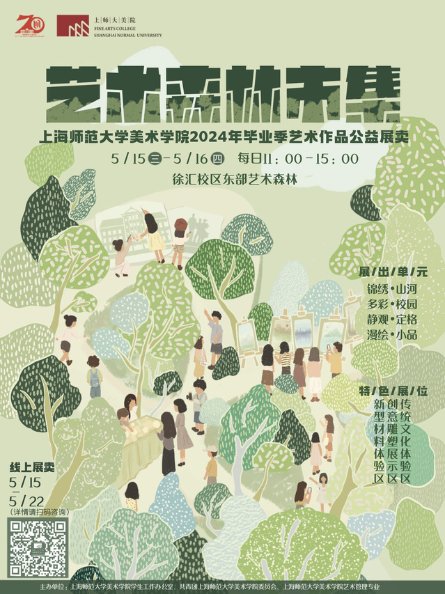 畢業季來臨,藝術森林市集——上海師范大學美術學院2024年畢業季藝術作品公益展賣活動將于5月15日11:00在徐匯校區東部藝術森林舉辦。快與好友作伴,和我們一起在藝術森林感受一件件作品下蘊含著的師大美院學子的愛與力量吧!