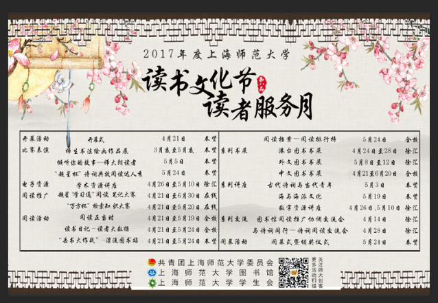 活動由校團委、圖書館聯合舉辦,以“悅讀,與詩詞同行”為主題,通過“比賽表演”,“電子資源”,“閱讀推廣”,“閱讀活動”,“系列書展”,“系列講座”,“系列交流”等七大板塊的十八個活動的開展,為徐匯和奉賢兩個校區的師大學子送上豐盛的書香文化盛宴。