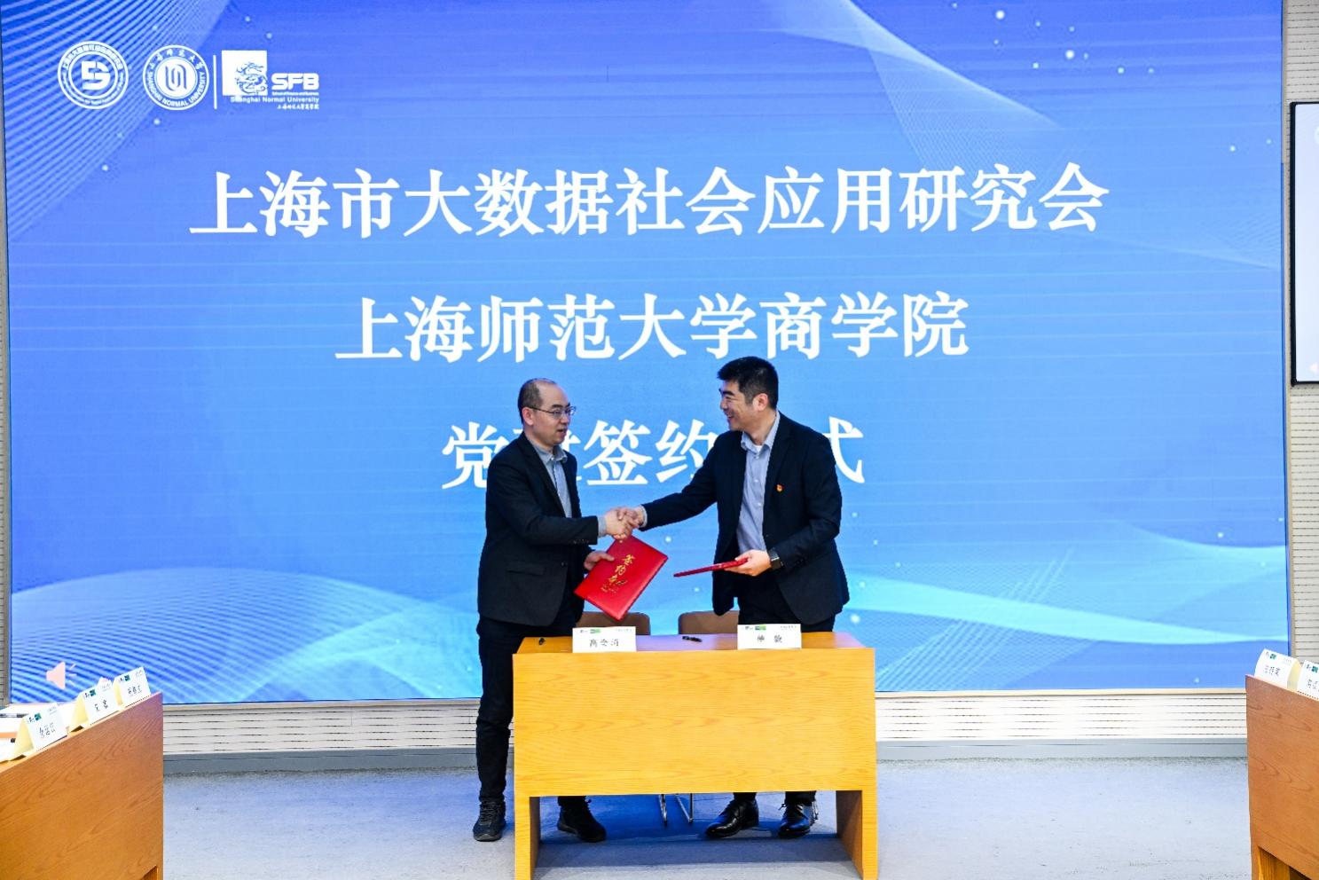 隨后,上海市大數據社會應用研究會與上海師范大學商學院簽署“黨建合作協議”,以“數字金融創新之路”為載體,探索“黨建+大數據”融合新模式。研究會副會長高奇琦教授與商學院黨委副書記傅毅教授代表雙方簽約。