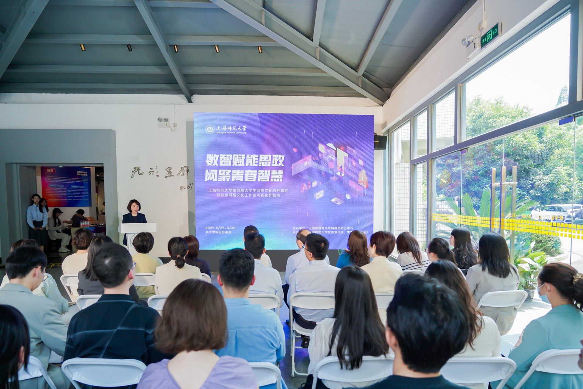 5月26日中午,上海師范大學第四屆大學生網絡文化節開幕式暨校級網絡文化工作室可視化作品展在徐匯校區東部美術學院無形畫廊舉行。本次活動由上海市教育系統網絡思政分中心主辦,校黨委宣傳部、校學生工作部(處)承辦。活動以“數智賦能思政,網聚青春智慧”為主題,聚焦網絡文化創新與可視化表達,旨在通過青年大學生喜聞樂見的網絡作品,更好地傳遞主流價值,引領校園文化新風尚。上海教育系統網絡文化發展研究中心主任彭東愷,校黨委副書記、副校長朱惠軍,各高校黨委宣傳部、學工部領導,以及我校相關職能部門、學院的領導和各網絡文化工作室師生代表參加。開幕式由校學生工作部(處)長朱政主持。