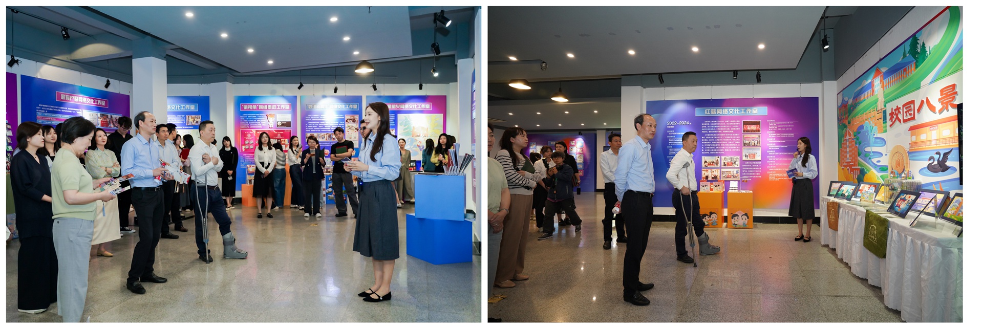 與會嘉賓和師生在展覽講解員王者的帶領下參觀了校級網絡文化工作室可視化作品展,欣賞了17個網絡文化工作室的創作成果,與展位前的工作室成員互動交流。