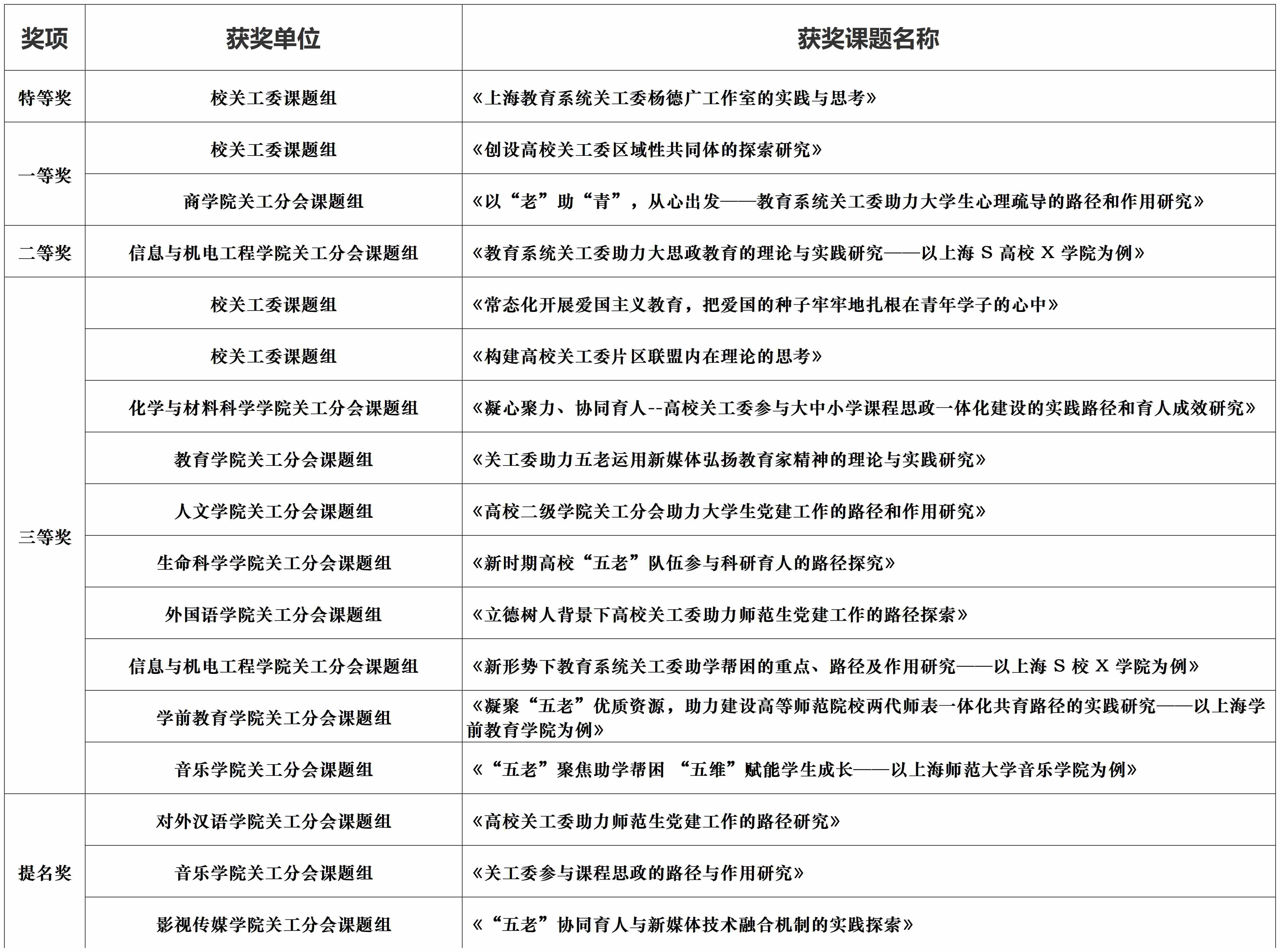 近日,根據(jù)2024年度市教育系統(tǒng)關(guān)心下一代工作課題研究相關(guān)評(píng)選標(biāo)準(zhǔn),我校關(guān)工委榮獲“上海市教育系統(tǒng)關(guān)心下一代工作課題研究?jī)?yōu)秀組織獎(jiǎng)”。校關(guān)工委課題組《上海教育系統(tǒng)關(guān)工委楊德廣工作室的實(shí)踐與思考》榮獲第17次(2024年度)上海市教育系統(tǒng)關(guān)心下一代“課題研究成果獎(jiǎng)”特等獎(jiǎng)。校關(guān)工委課題組《創(chuàng)設(shè)高校關(guān)工委區(qū)域性共同體的探索研究》、商學(xué)院關(guān)工分會(huì)課題組《以“老”助“青”,從心出發(fā)——教育系統(tǒng)關(guān)工委助力大學(xué)生心理疏導(dǎo)的路徑和作用研究》、信息與機(jī)電工程學(xué)院關(guān)工分會(huì)課題組《教育系統(tǒng)關(guān)工委助力大思政教育的理論與實(shí)踐研究——以上海S高校X學(xué)院為例》、影視傳媒學(xué)院關(guān)工分會(huì)課題組《“五老”協(xié)同育人與新媒體技術(shù)融合機(jī)制的實(shí)踐探索》等16項(xiàng)課題分別獲得一等獎(jiǎng)、二等獎(jiǎng)、三等獎(jiǎng)和提名獎(jiǎng)。