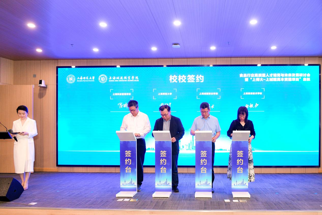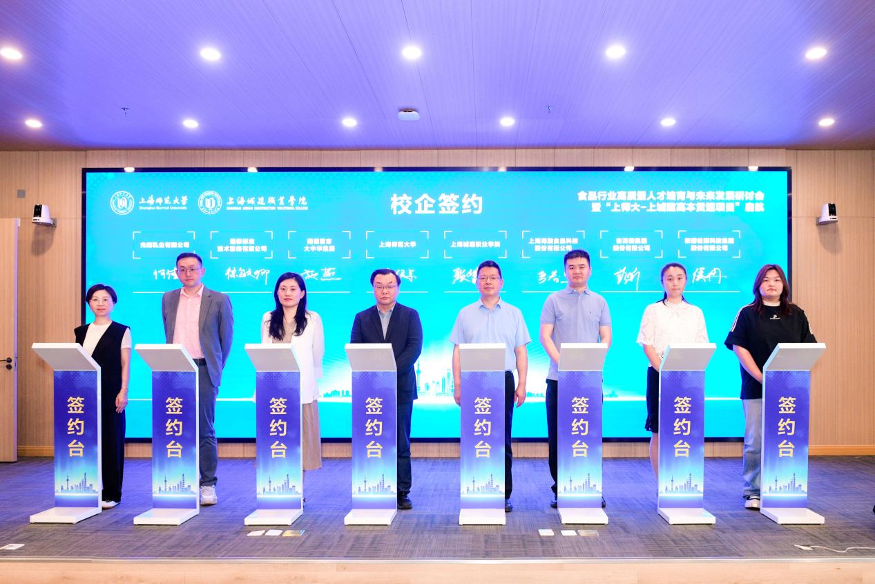 會上,上海師大生命科學學院與上海城建職業學院食品與旅游學院等單位共同簽署全方位合作框架協議。同時,與光明乳業、SGS通標標準技術服務有限公司、TüV南德意志集團(大中華區)、海融食品科技、杏花樓集團和微譜檢測科技集團等行業領軍企業簽署校企合作協議,共建“實訓-實習-就業”食品行業人才培養的一體化平臺。