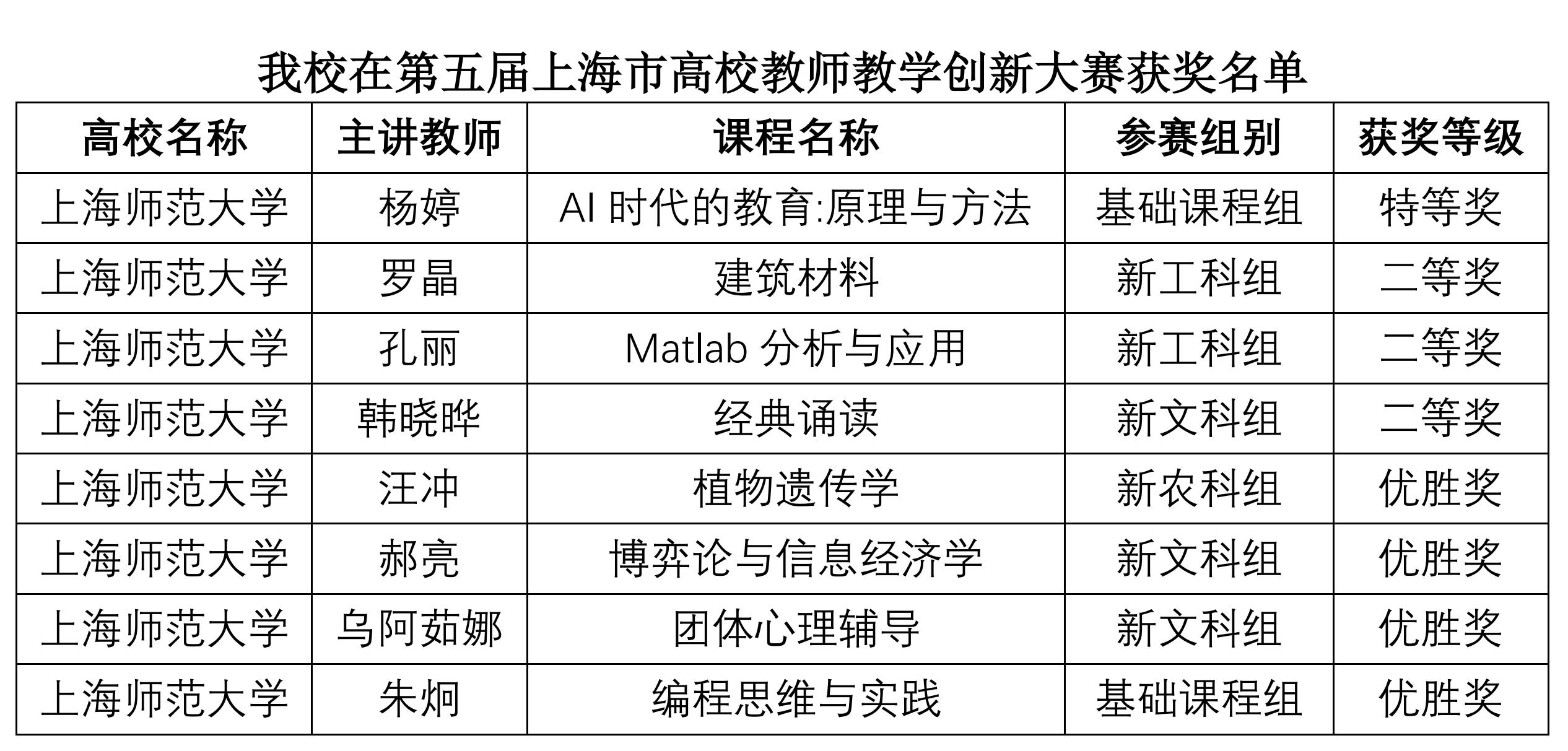 近日,上海市教育委員會公布了第五屆上海市高校教師教學創新大賽獲獎名單(滬教委高〔2025〕22號),我校教師團隊表現優異,喜獲特等獎1項,二等獎3項,優勝獎4項。其中,教育學院楊婷老師憑借出色的教學創新成果榮獲基礎課程組特等獎,并成功入選為上海市代表選手,將參加第五屆教師教學創新大賽全國賽的角逐。