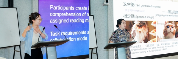 李婧偉圍繞“人機(jī)協(xié)作模式對(duì)藝術(shù)創(chuàng)作體驗(yàn)的影響”開展的研究工作,深入剖析了“人機(jī)協(xié)作如何影響學(xué)生認(rèn)知投入、內(nèi)在動(dòng)機(jī)及感知成就”這一核心議題,系統(tǒng)呈現(xiàn)了研究設(shè)計(jì)思路、階段性成果以及成果運(yùn)用。龔艷老師以《AI賦能課堂創(chuàng)新短視頻制作》為主題,介紹了國(guó)內(nèi)外主流AI生成視頻工具,并現(xiàn)場(chǎng)演示了從利用DeepSeek生成文案與分鏡腳本、到AI軟件逐幀生成、再通過(guò)剪映高效剪輯,最終輸出高質(zhì)量短視頻的全流程實(shí)戰(zhàn)。陳華老師圍繞《生成式人工智能(AIGC)驅(qū)動(dòng)下的機(jī)遇與挑戰(zhàn)》,深度探討了AI重塑教育的巨大潛力與現(xiàn)實(shí)挑戰(zhàn),并重點(diǎn)推介了中國(guó)具有代表性的生成式AI平臺(tái),精解其核心功能、適用場(chǎng)景與差異化優(yōu)勢(shì),為與會(huì)者提供了AIGC技術(shù)在教育應(yīng)用方面的具體參考。