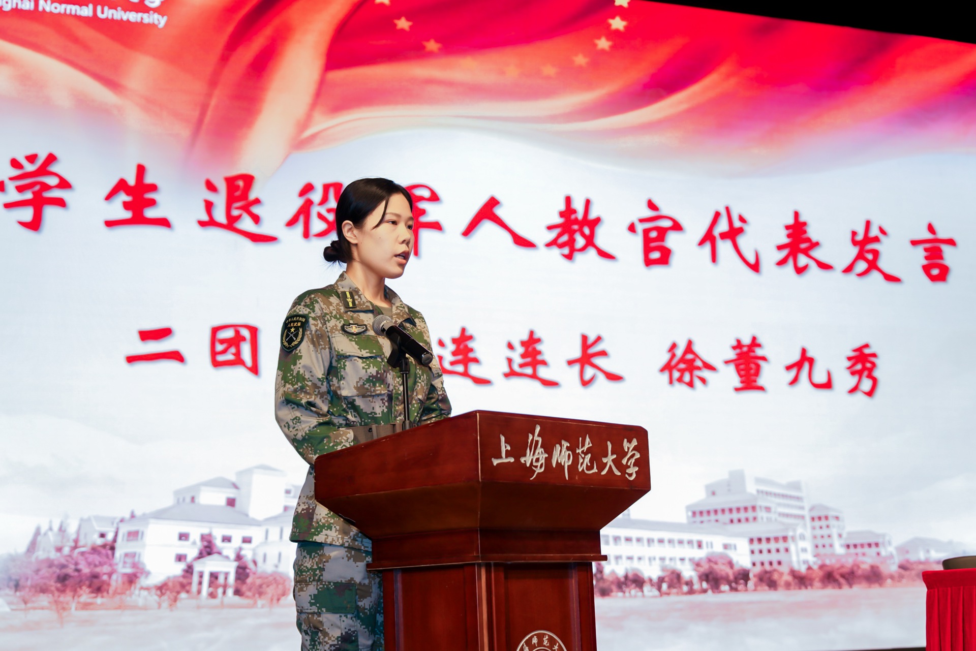 二團十七連的徐董九秀作為教官代表發言,號召全體參訓同學以軍人標準嚴格要求自己,在烈日與風雨中褪去嬌氣、鍛造骨氣,將軍訓的每分每秒都化作成長的堅實階梯。