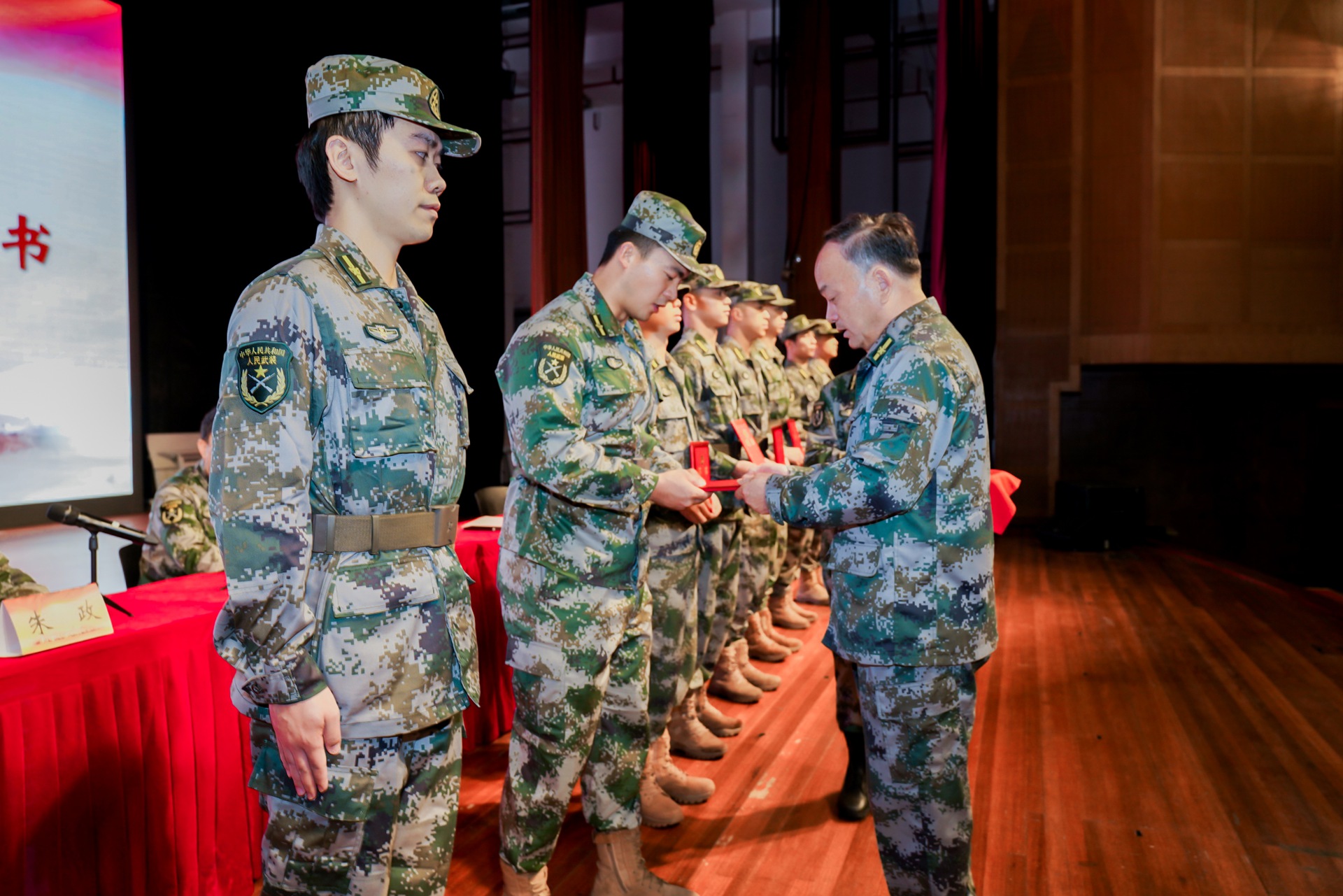 朱惠軍為各連指導員授旗,鮮紅旗幟迎風舒展,象征著使命與擔當的傳遞,激蕩起青春逐夢的奮進力量。
