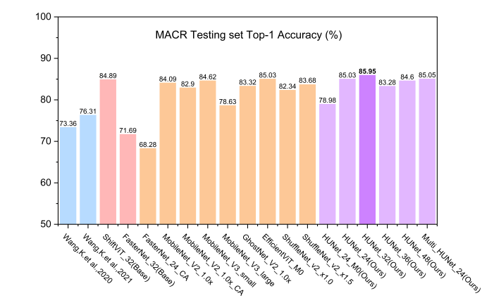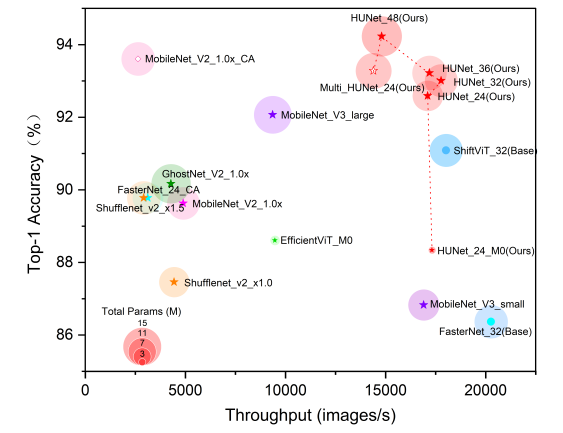 實(shí)驗(yàn)結(jié)果表明,HUNet模型在MTACCR數(shù)據(jù)集和多場景古漢字識別(MACR)數(shù)據(jù)集上的測試性能表現(xiàn)優(yōu)異。與其他參與評估的高效CNNs和ViTs模型相比,HUNet在參數(shù)量相當(dāng)?shù)那闆r下實(shí)現(xiàn)了更高的識別性能,或在識別性能相當(dāng)?shù)那闆r下保持了更低的參數(shù)量,同時維持了較高的計(jì)算吞吐量。在MTACCR Test_1測試集上(包含60萬測試樣本),HUNet_48的Top-1準(zhǔn)確率達(dá)到94.23%。在MACR測試集上,使用MTACCR訓(xùn)練的HUNet模型的Top-1準(zhǔn)確率提升了9.64%。此外,HUNet還可有效擴(kuò)展到非漢字古代文本識別任務(wù),在DeepLontar和ALPUB_v2兩個數(shù)據(jù)集上表現(xiàn)出一定的競爭優(yōu)勢。