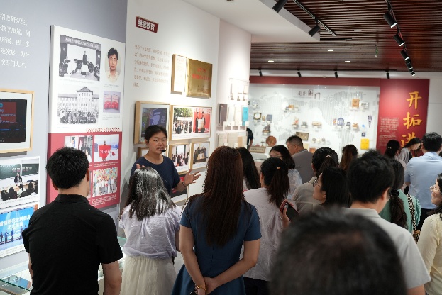 與會青年教師集中參觀校史館。洪玲為學院教師詳細講解了主館傳承、求索和立人三大板塊,通過大量的具有歷史意義的“首次”和“重大”事件的圖片介紹了學校的發展脈絡。青年教師還通過實物展品與互動體驗裝置、三原色印章打卡等體驗活動深入體會學校自強不息的歷史傳統和師道永恒的文化底蘊。