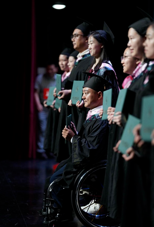 在6月末的上海師范大學(xué)高等學(xué)歷繼續(xù)教育畢業(yè)典禮暨學(xué)位授予儀式上,上海市百姓學(xué)習(xí)之星、財(cái)務(wù)管理(專升本)畢業(yè)生盧鵬坐在輪椅上分享了他身殘志堅(jiān)仍堅(jiān)持終身學(xué)習(xí)的故事。