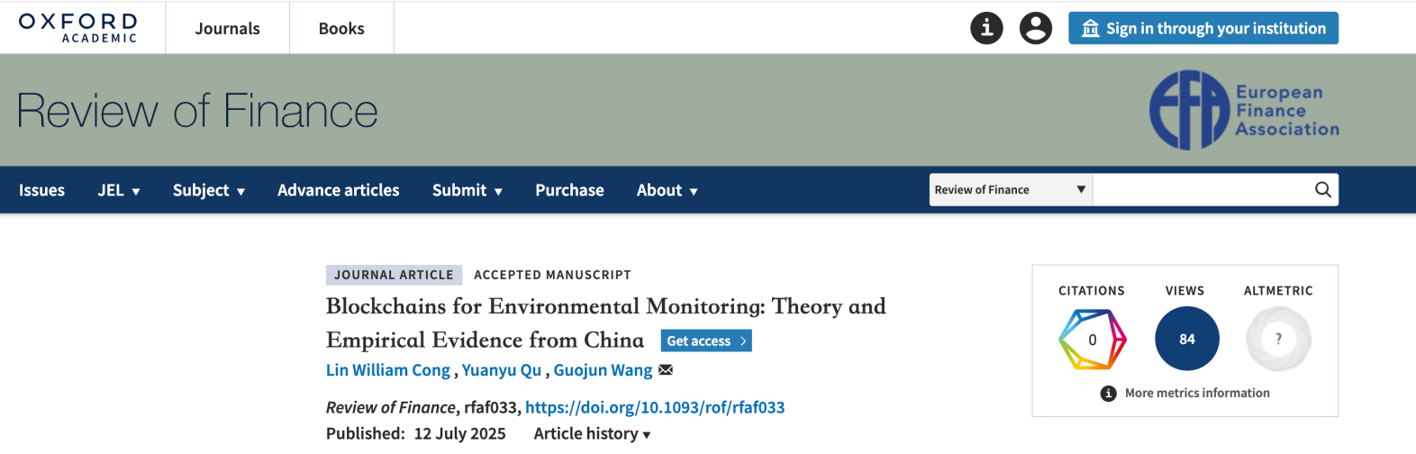 上海師范大學商學院王國俊副教授作為通訊作者與康奈爾大學叢林教授以及對外經貿大學屈源育教授的合作論文《Blockchains for Environmental Monitoring: Theory and Empirical Evidence from China》(《區塊鏈環境監測:來自中國的理論與實證證據》)受邀初次投稿國際金融學頂刊《Review of Finance》,已被正式接收并在線發表。《Review of Finance》被廣泛認為是金融領域的頂級期刊之一,同時也入選了金融時報頂級商學院學術期刊列表(FT50)。該期刊由歐洲金融協會 (European Finance Association, EFA)主辦,牛津大學出版社 (Oxford University Press, OUP)出版,與Journal of Finance,Journal of Financial Economics,Review of Financial Studies,Journal of Financial and Quantitative Analysis并稱為金融學五大頂級期刊。該論文系我校首次在該期刊發表,標志著我校在金融學頂級期刊發表論文實現零的突破。