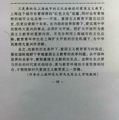 (三)抓住上海城市的文化品格進(jìn)行愛國(guó)主義教育。上海這個(gè)城市有著深厚的“紅色文化”底蘊(yùn)“,同時(shí)也有著獨(dú)特的城市文化品格——開放。愛國(guó)主義教育不能忘記歷史,更應(yīng)著眼于未來(lái)。在當(dāng)前的世界形勢(shì)下,要實(shí)現(xiàn)中華民族偉大復(fù)興的事業(yè),必須擴(kuò)大開放。把擴(kuò)大開放作為愛國(guó)主義教育的重要內(nèi)容,并充分利用上海城市的文化品格,教育青年學(xué)生在上海擴(kuò)大開放的歷史機(jī)遇下,為中華民族偉大復(fù)興做貢獻(xiàn)。